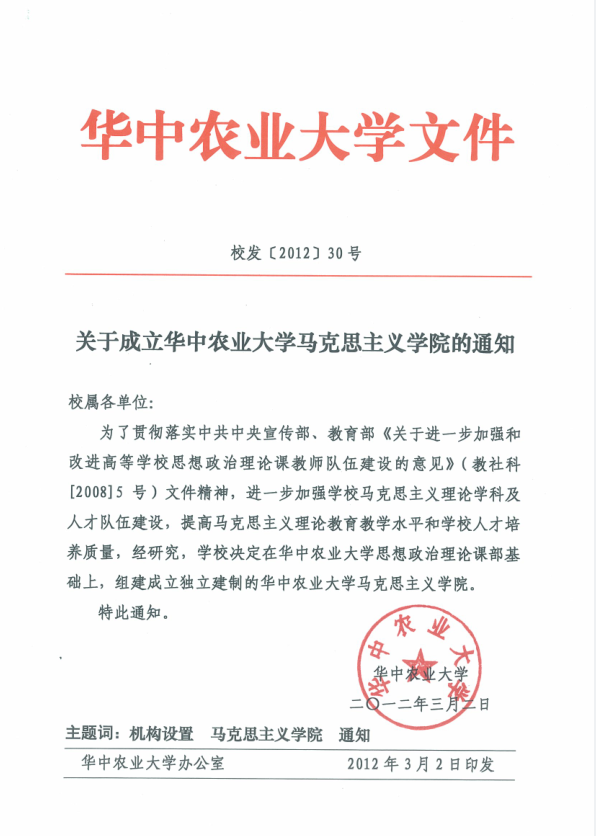 开云电竞游戏马克思主义学院成立于2012年3月,其前身为1952年华中农学院成立时组建的马列主义教研组。1984年学校成立马列主义理论课部,2008年5月思想政治理论课部被确定为正处级建制;2012年3月,学校在思想政治理论课部基础上组建独立建制的马克思主义学院。学院成立以来,坚持育人为本、特色立院,加强党的建设、队伍建设、学科建设、科学研究、课程建设和制度建设,全院教职员工和衷共济、协同育人、克难奋进、开拓创新,扎实推进学院事业又好又快发展。