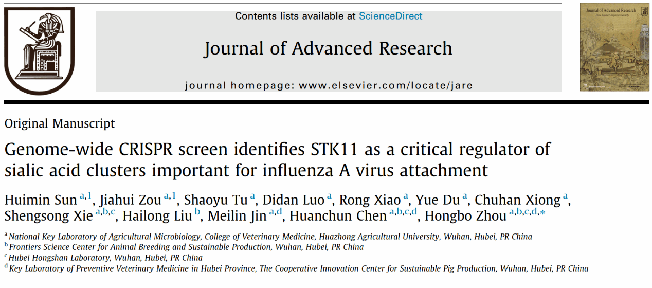 南湖新闻网讯(通讯员 孙慧敏)近日,我校农业微生物资源发掘与利用全国重点实验室、动物育种与健康养殖前沿科学中心、湖北洪山实验室、动物医学院周红波教授团队在流感病毒与宿主相互作用机制研究中取得重要进展。相关研究成果以 “Genome-wide CRISPR screen identifies STK11 as a critical regulator of sialic acid clusters important for influenza A virus attachment”为题在Journal of Advanced Research期刊上发表。