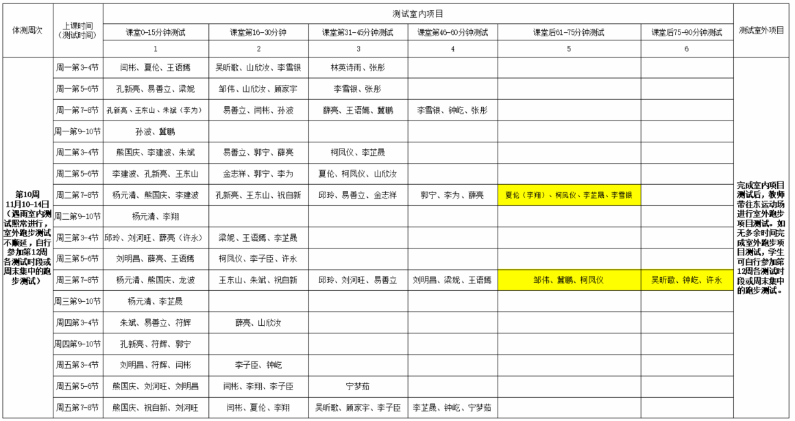 学校本部学生:室内项目2025年10月31日、11月6日、11月28日,晚上18:40-21:00,室外项目2025年11月30日,上午08:30-11:30、下午14:30-17:30(2025年度最后一轮测试时间另行通知)