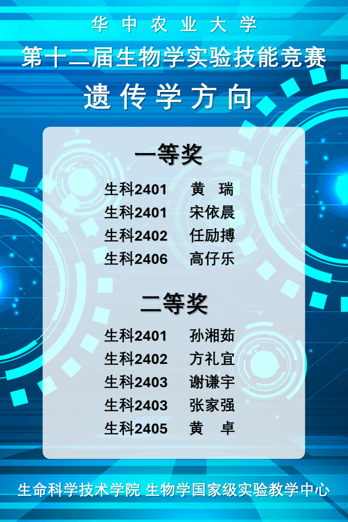 (通讯员:王烨韡 )12月5日,由生命科学技术学院国家级生物学实验教学示范中心主办的第十二届生物学实验技能竞赛(遗传学方向)在第一综合楼 307 教室顺利落幕。我院生科方向的 28 名学子同台竞技,经过激烈角逐,最终评选出一等奖 4 名、二等奖 5 名。(名单见下图)