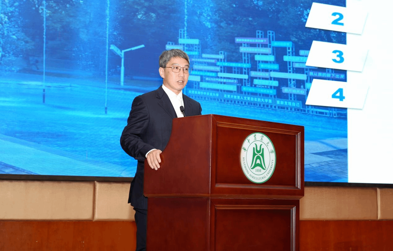 作为生命科学交叉学院首任院长,严建兵校长从“为什么要建、怎么建、建成什么样”三个方面阐述了学院建设的整体思路。他表示,生命科学交叉学院将坚持党建引领,引导师生牢记“国之大者”,厚植家国情怀,聚焦国家战略需求,创新体制机制,推动教育科技人才一体发展。 他从“一个深度融合、两大核心引擎、三项关键机制”总结了学院建设的理念。他强调,生命科学交叉学院与洪山实验室深度融合、一体化运行不是简单的物理叠加,而是战略、资源、任务、人员的化学融合。学院以项目制驱动与AI赋能为引擎,促进交叉融合;设立本博贯通创新班,建立“本博贯通、书院制、导师制”培养机制;实行“首席科学家负责制”,开展有组织科研;创新“贡献导向、多元多维”的评价机制,树立以创新价值、能力、贡献为核心的评价导向。他提出,生命科学交叉学院要引领学科范式变革,深化学科交叉融合,推进产教融合、科教融汇与国际合作,将学院建成世界生物育种与农业合成生物学拔尖创新人才培养高地、服务国家粮食安全与生命健康重大战略的一流农业生命科学创新策源地、农业生物产业高质量发展的创新引擎与先行区、世界一流科技人才的富集区、具有全球影响力的生命科学国际交流合作中心。他勉励师生在“敢闯敢干、追求卓越”的奋斗精神指引下,克服困难,努力把蓝图化为现实。