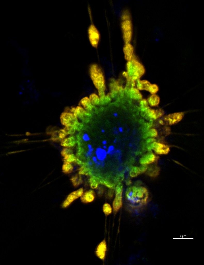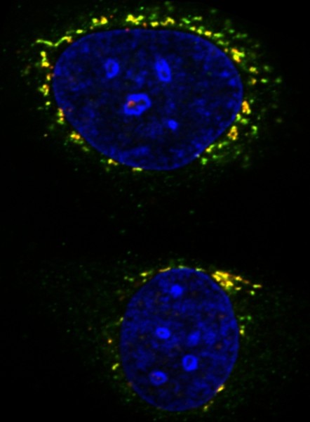 动科动医学院研究生李琦的作品《向阳花》则是借助激光共聚焦显微镜观察HeLa细胞上蛋白A与蛋白B亚细胞定位情况时,偶然捕捉到的画面。她说,这张图片是历经无数次实验失败后收获的一缕阳光,愿每一位曾在科研道路上遭遇迷茫、历经挫败的同行者都能像向日葵一样,永远面向光亮,坚定地生长。