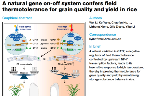 开云电竞游戏作物遗传改良全国重点实验室、生命科学技术学院、湖北洪山实验室水稻团队李一博教授课题组历经10余年研究,从来自中国、菲律宾、巴基斯坦、印度尼西亚、埃及、印度等国家万份种质中,发现8份在10年自然高温下稳定低垩白的种质,进而通过遗传分析,鉴定出耐自然高温的关键基因QT12,并揭示了其背后的分子机制,为水稻在高温环境下实现稳产提质及育种提供新策略。