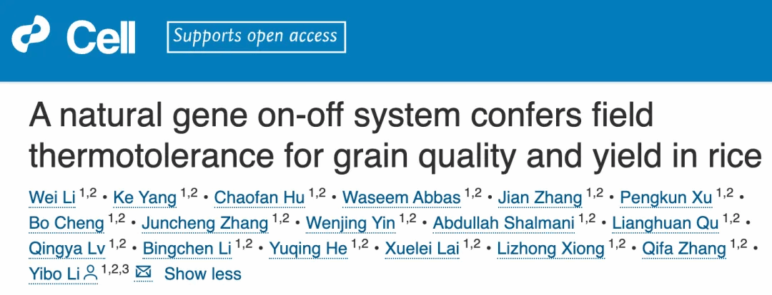 2025年4月,开云电竞游戏教授李一博团队在Cell期刊发表论文。该研究发现了水稻中的一种天然基因开关系统,赋予了其田间热耐受性,从而提升了水稻的品质和产量。