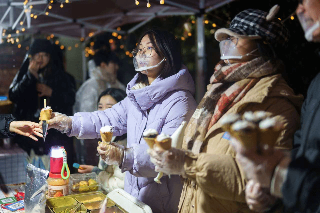 美食区打造独特味蕾体验,生命科学技术学院以学校选育的“华墨香”黑米制作热奶宝、养生粥等跨年美食,参与者在品尝美味时,亲身感受“从实验室到餐桌”的科研转化魅力。“多维玉米矩阵”项目则依托校长严建兵教授研究团队关于甜玉米风味基因研究成果,制作出了墨西哥风味玉米条等美食,让硬核科研成果走出实验室,成为可感可及的味觉盛宴。