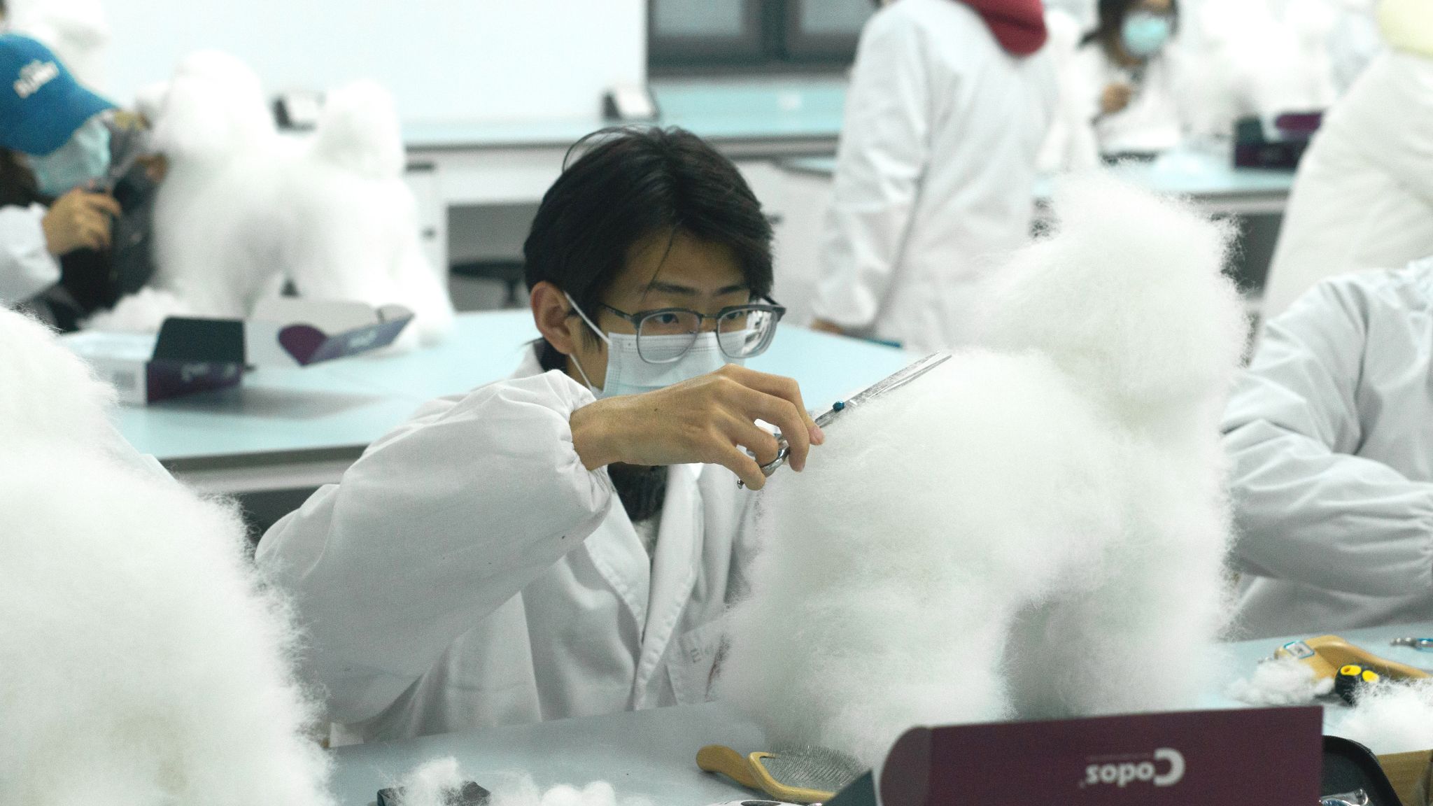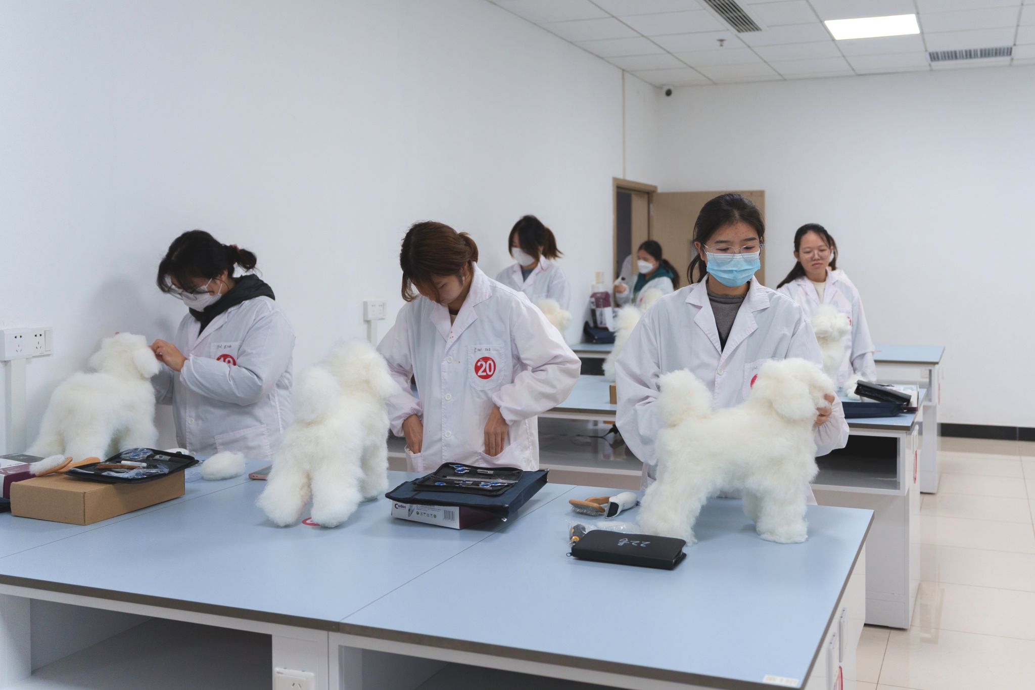 比赛在紧张的氛围中正式开始,选手们需要在160分钟内,给带有7cm假毛的模型犬修剪出经典的“拉姆装”造型。选手们首先用电推剪为贵宾犬塑造轮廓,这是决定造型整体比例的关键一步,再使用直剪按照拉姆装修剪标准,对模型犬的头部以及躯干进行修剪。优秀的拉姆装要求全身做圆到位、不见棱角,展现出柔和可爱的整体感。在剪刀翻飞间,选手们将这一标准转化为一件件柔和圆润、栩栩如生的作品,萌态可掬的拉姆装模样逐渐显现出来。
