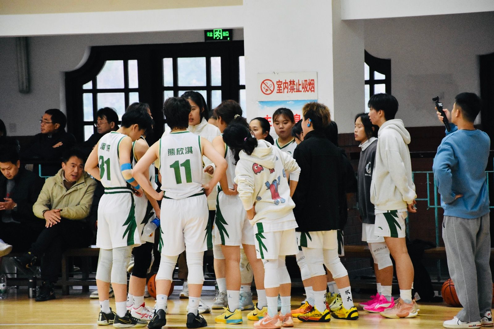 主教练吴昕歌在暂停时间与队员沟通、布置战术