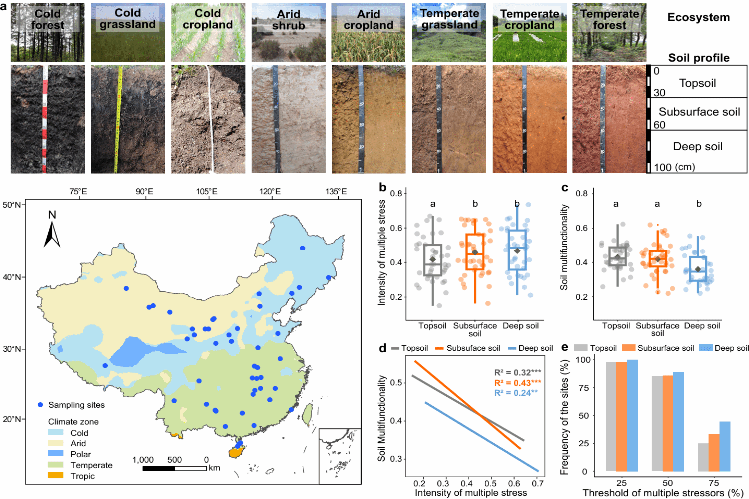 然而,多重胁迫对土壤剖面的生态效应仍不明确。研究团队进一步在全国44生态系统采集了0-1 m土壤剖面样品,聚焦气候变化、人类活动、土壤污染与退化相关的8类全球变化胁迫因子与6种关键生态功能,基于多胁迫阈值法与平均多功能指数等,探究了土壤生态功能与全球变化的关系。发现多胁迫生态效应可以渗透到深层土壤,随着多重胁迫因子数量的增加,土壤全剖面的生态多功能性显著下降(图2)。其中,多重胁迫数量对深层土壤多功能性变异的解释量最大,且在中等胁迫水平(即胁迫强度超过最大观测值的50%)时,其负效应最为显著。此外,不同情景分析表明,多胁迫因子数量高的环境中,单一气候胁迫因子对生态功能的负效应进一步被放大,且该“胁迫增强效应”在深层土壤中尤为显著。这些结果在全国尺度上阐明了多重胁迫对土壤生态功能的影响特征,为土壤生态系统多功能服务的维持和可持续管理提供重要理论依据。
