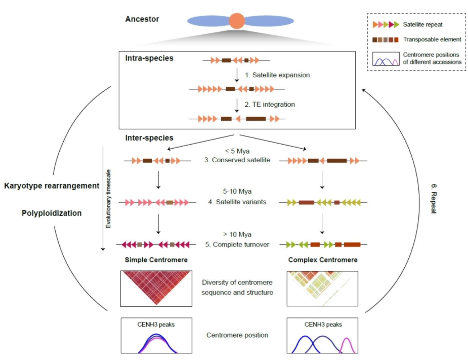 图2 植物种内、种间及属间着丝粒结构与功能演化模式图