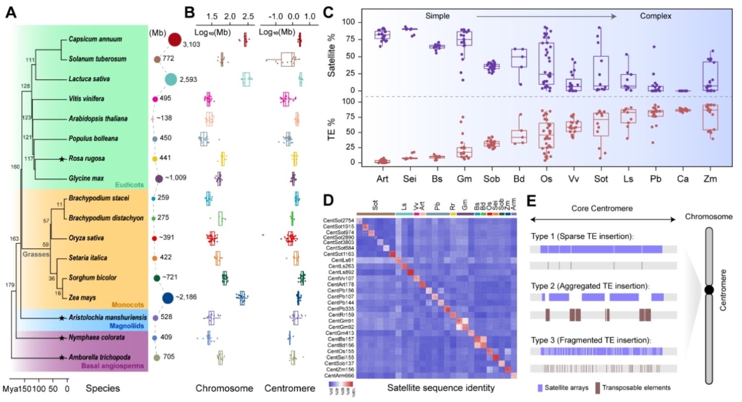 为了回答这一问题,研究团队整合分析了17种被子植物400多个完整解析的着丝粒,同时结合上千个泛基因组和近缘物种的群体基因组数据,首次在单碱基精度上,跨越约1.8亿年的演化尺度,系统描绘了植物着丝粒在物种进化、群体分化和染色体重排过程中的动态变化规律。研究发现,被子植物的着丝粒并非结构单一,而是由卫星重复序列和转座子两类重复DNA以不同比例组合而成。不同谱系植物在长期进化过程中形成了各具特色的着丝粒结构模式:有的以高度同质化的卫星序列为主,结构相对简单而稳定;有的则富集大量转座子,形成更为复杂、多层次的着丝粒架构。这种差异反映了不同植物基因组在演化过程中,对结构稳定性与序列创新间作出的不同权衡。进一步分析表明,转座子的插入和扩增是推动着丝粒结构多样化的重要动力。转座子不仅会打断原有的卫星序列结构,还可能改变着丝粒蛋白CENH3的结合区域,从而引发着丝粒大小变化,甚至导致染色体上的位置发生迁移。例如,在某些转座子富集的植物中,着丝粒发生重新定位的频率明显升高,提示转座子活动可能为染色体结构创新提供了重要“原材料”。