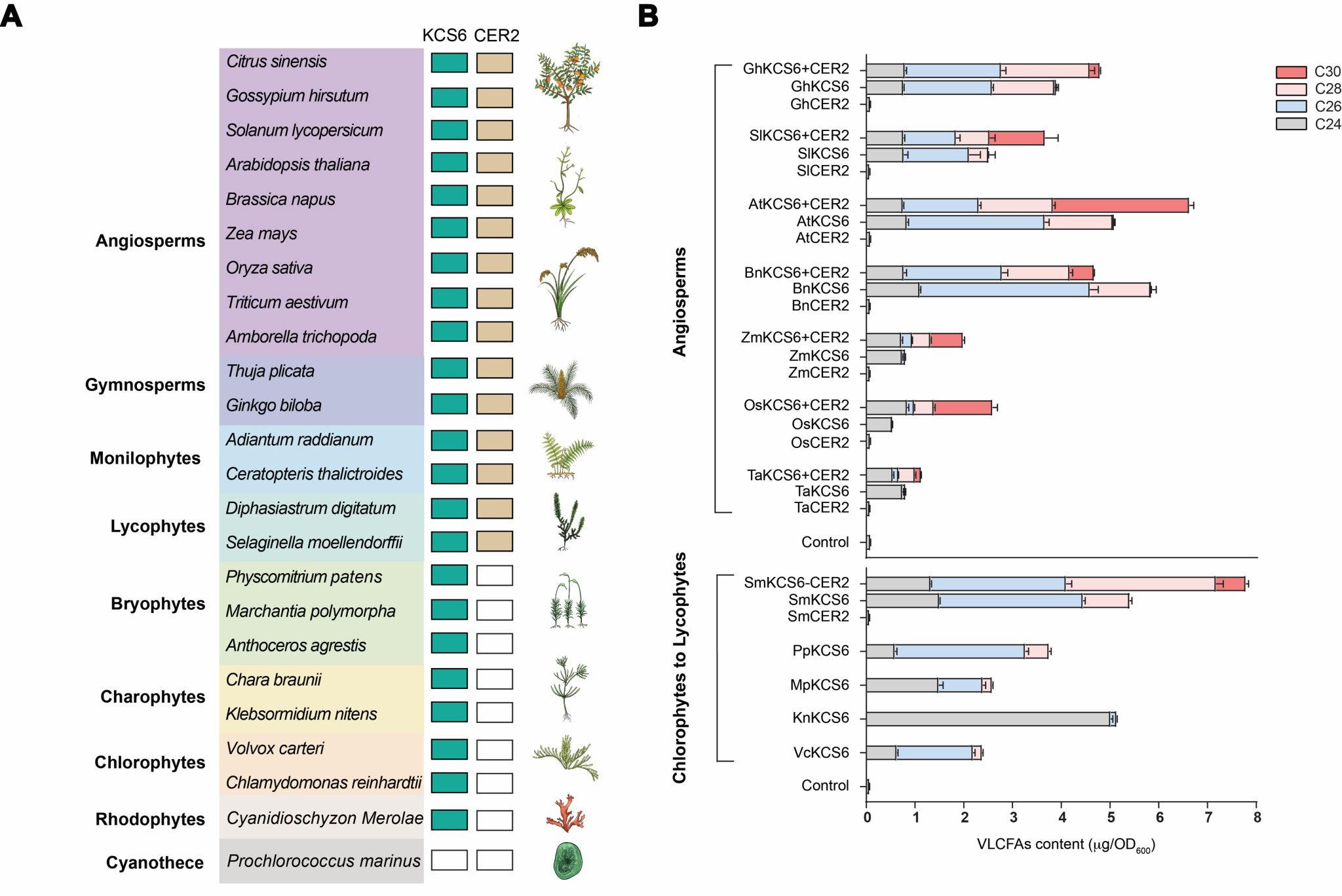 超长链脂肪酸(VLCFAs,≥C20)在众多生命活动中发挥着至关重要的作用。植物中C20–C24 VLCFAs主要参与膜磷脂的合成,调节细胞膜的流动性和稳定性;C26–C28 VLCFAs在植物的花粉壁结构形成中具有关键作用;C30及以上的VLCFAs则主要参与形成植物表皮细胞外的蜡质结构,减少水分流失、紫外线损伤及高温胁迫等,对植物适应陆地环境至关重要。此外,VLCFAs还是化妆品、药品及生物燃料等工业领域的重要原料。