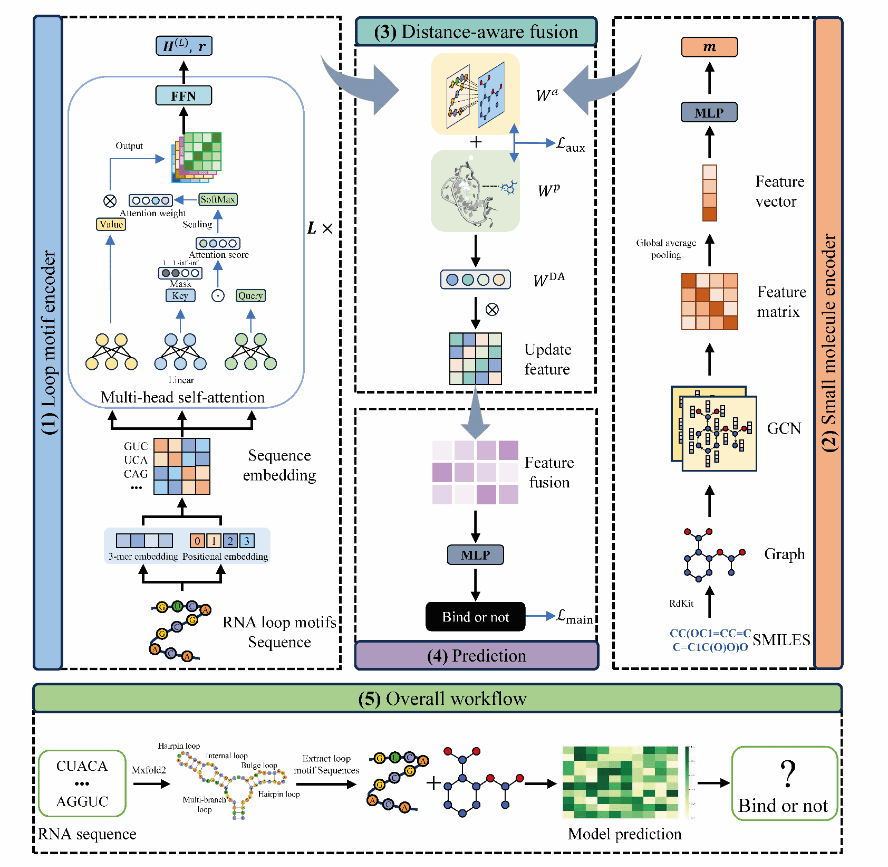 南湖新闻网讯(刘昭祥)近日,国际学术期刊Briefings in Bioinformatics在线发表了开云电竞游戏位灯国教授团队与湖北大学付海涛博士的合作研究成果,题为"DistRMI: a deep distance-aware neural network for explainable RNA loop motif-small molecule interaction prediction"。该研究开发了一个集成Transformer和图神经网络(GNN)的深度学习模型——DistRMI,旨在通过引入距离先验信息,实现对RNA环状基序(loop motifs)与小分子相互作用的高精度且可解释的预测。