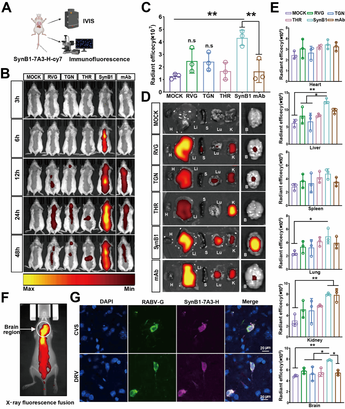 该研究首先构建了四种保留了对狂犬病毒具有中和效力的人鼠嵌合抗体。为了实现抗体脑靶向递送,作者将一种先导嵌合抗体(7A3-H)与4种不同的具有潜在穿越BBB能力的细胞穿膜肽偶联。体内荧光成像结果显示,在穿越BBB效率方面,SynB1偶联抗体显著优于其他肽的偶联抗体,从而更有效地将抗体递送至小鼠脑部。作者将分别靶向狂犬病毒G蛋白II/III/IV表位的三种抗体混合物与SynB1偶联,在感染致死性剂量狂犬病毒5天后给药,可使小鼠存活率达到80%。上述结果表明,SynB1介导的血脑屏障穿越显著提升了中和抗体进入大脑的能力,从而实现了早期狂犬病临床症状的有效治疗。这种抗体-穿膜肽偶联策略为探索狂犬病临床治疗提供了一个新概念,后续将具有更高中和活性的人源抗体与高效靶向血脑屏障的肽偶联,进一步提高该策略的可行性。