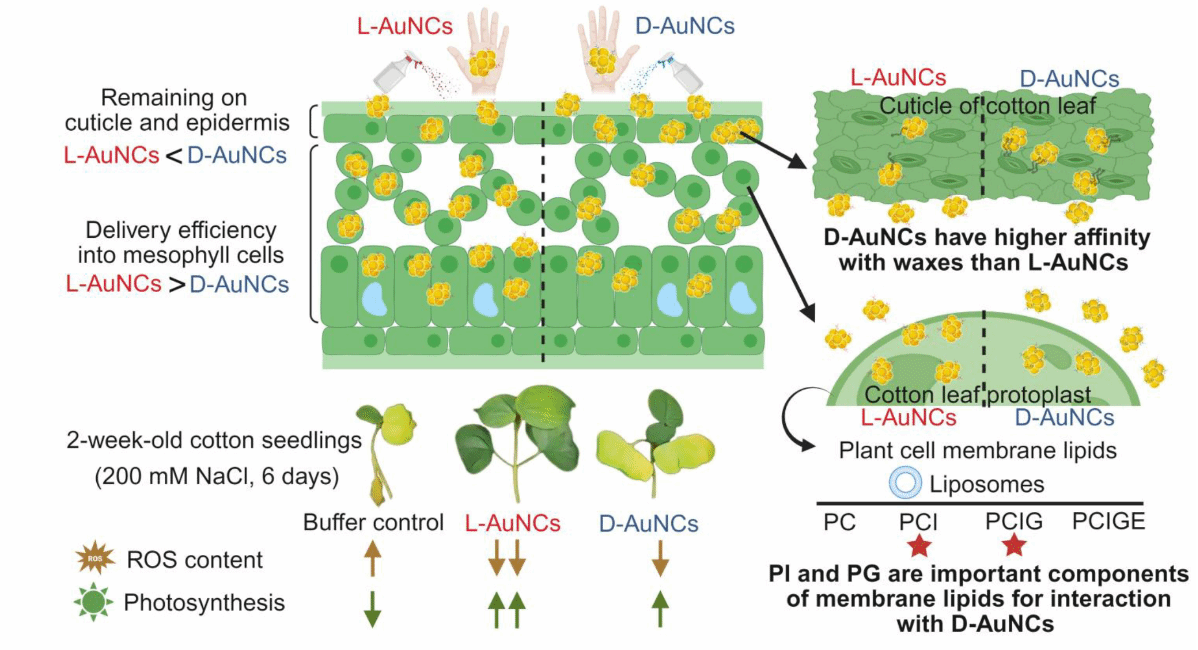 研究团队制备了除手性外具备相同理化特征的纳米金簇应用于棉花耐盐研究中。结果表明,左旋和右旋纳米金簇均能显著提升棉花耐盐性,显著降低盐胁迫造成的氧化应激损伤,且左旋纳米金簇处理组表现出更优的生理指标和更好的光合性能。此外,盆栽试验结果表明,盐胁迫下左旋金簇处理组可持续提高棉花幼苗期、蕾期、铃期等关键发育阶段的耐盐性,最终使籽棉产量较对照组显著提升。结合共聚焦成像、电感耦合等离子体质谱等技术手段,该团队证实左旋纳米金簇在棉花叶肉细胞中的递送效率显著高于右旋纳米金簇。通过对棉花叶片的表皮、细胞壁和细胞膜等结构与手性金簇相互作用的研究表明,蜡质层和细胞膜是调控手性纳米金簇递送效率的关键屏障,其中右旋纳米金簇与叶角质层中的二十八烷存在更强的特异性相互作用,同时与质膜中的磷脂酰肌醇和磷脂酰甘油结合亲和力更高,导致其难以穿透生物屏障进入叶肉细胞,而左旋纳米金簇与上述生物组分的相互作用相对较弱,从而能更高效地递送到细胞中。