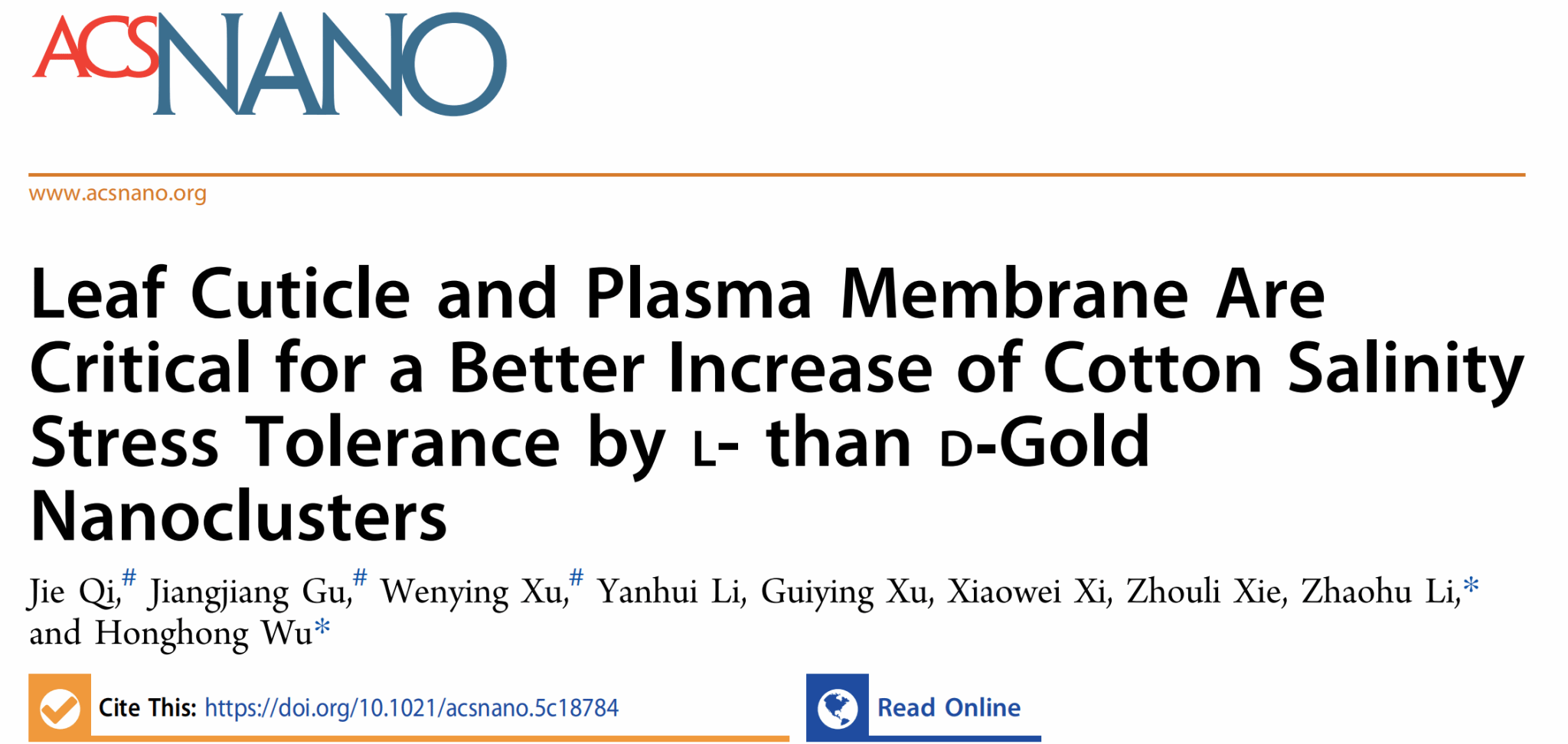 南湖新闻网讯(通讯员 戚杰 赵怡帆)近日,我校植物科学技术学院、湖北洪山实验室吴洪洪教授领衔的作物纳米生物学团队在国际学术期刊《ACS Nano》发表了题为“Leaf Cuticle and Plasma Membrane Are Critical for a Better Increase of Cotton Salinity Stress Tolerance by L- than D‑Gold Nanoclusters”的研究论文。该研究首次系统阐明了纳米材料的手性特征在作物耐盐性调控中的核心作用,揭示了叶片蜡质层中的二十八烷烃和细胞质膜关键组分磷脂酰肌醇和磷脂酰甘油能更有效的结合右旋纳米金簇,导致作物更偏好吸收左旋纳米金簇,从而表现为左旋纳米金簇比右旋纳米金簇能更好地提高棉花耐盐性,为作物纳米调节剂的精准设计与定向优化提供了理论依据和研究范式。