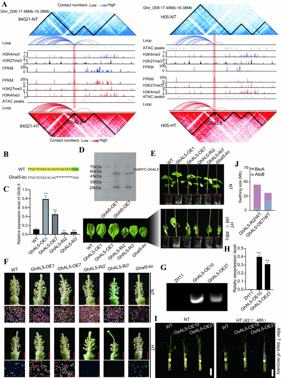 最后通过整合三维基因组动态与共表达网络,锁定了一个Alfin-like家族转录因子基因GhAL5。在耐热材料中,GhAL5稳定位于TAD边界,且连接丰富的染色质环;而在敏感材料中,高温胁迫驱动GhAL5从TAD内部迁移至边界,伴随染色质环的显著增加与基因的剧烈诱导表达。Capture-C实验证实了该位点在高温下的染色质互作动态。在棉花中过表达GhAL5显著增强了苗期耐热性和高温下的花粉活力,而RNAi干扰和CRISPR敲除株系则表现出热敏感表型和极高的花粉不育率。将GhAL5在水稻中异源过表达,同样能显著提升水稻的耐热性。在辣椒中的瞬时表达与基因沉默实验也验证了其功能的保守性。这表明GhAL5是一个具有广谱应用潜力的“热保护”基因。对GhAL5遗传材料的三维基因组分析发现,GhAL5 RNAi株系在高温下发生了更广泛的B向A区室转换,模拟了敏感材料的异常激活状态,而过表达株系则维持了更稳定的基因组拓扑结构(图2 )。这表明GhAL5可能通过“稳定TAD边界、防止染色质异常解压缩”和“通过其PHD结构域识别组蛋白修饰、调控增强子-启动子环化”的双重机制,协调三维基因组重排以保障转录稳态。