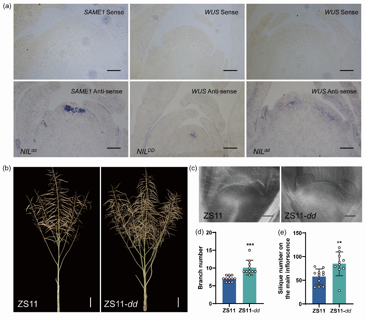 为了明确qDB.A09在改良现有品种一次有效分枝数和主花序角果数性状中的作用,研究人员将qDB.A09优异等位基因转育到常规品种中双11中,改良后的品系ZS11-dd相比于轮回亲本ZS11,一次有效分枝数和主花序角果数均有显著提升(图2)。
